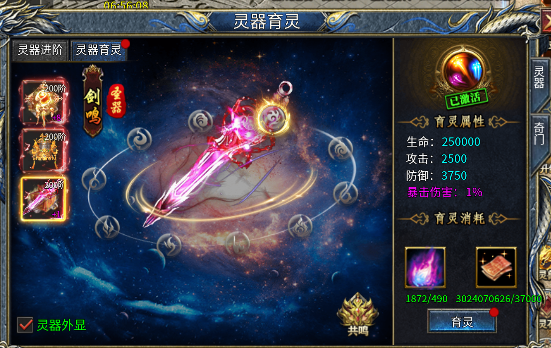 外观显示:可勾选「灵器外显」展示外观灵器育灵:消耗灵符,先天灵气可进行育灵,提升攻击加成、生命加成、暴击伤害,育灵达到特定等级可激活共鸣属性!
